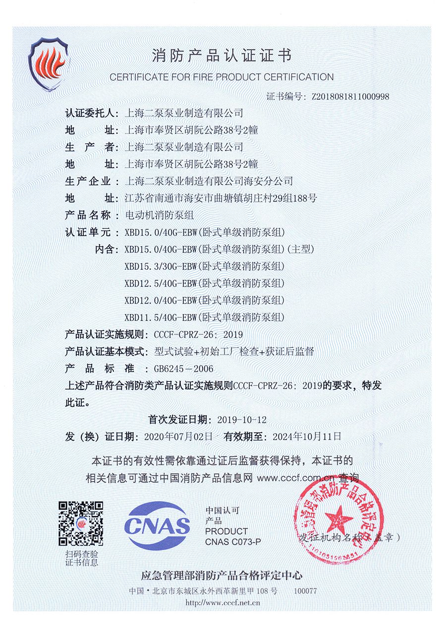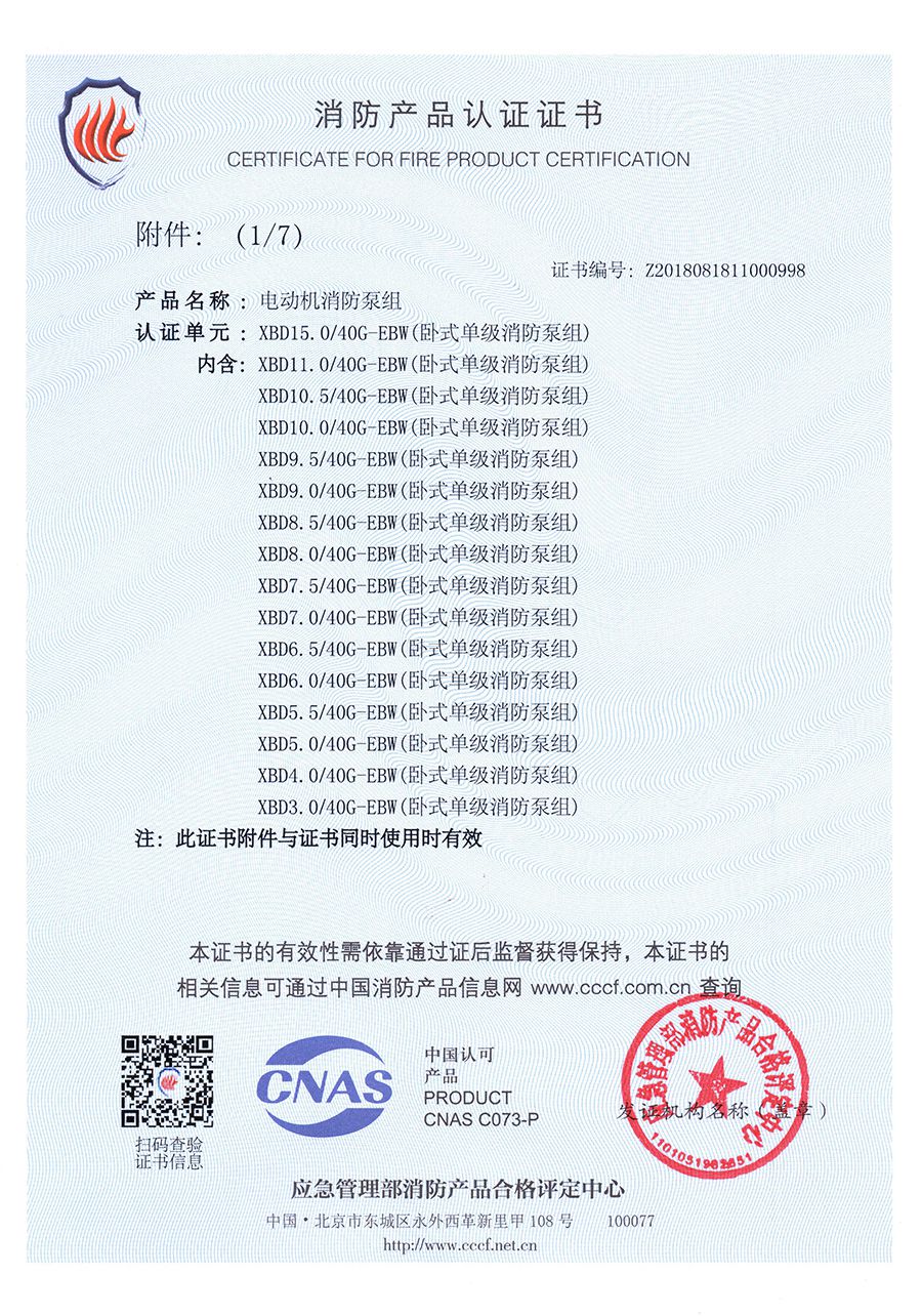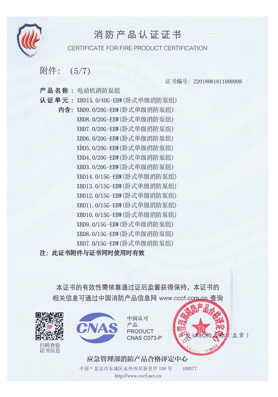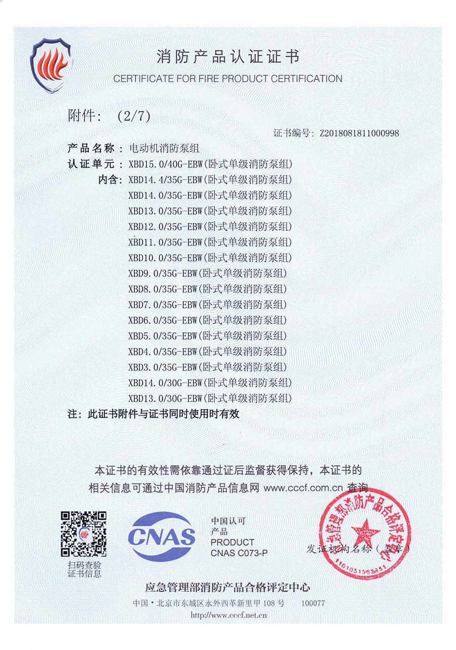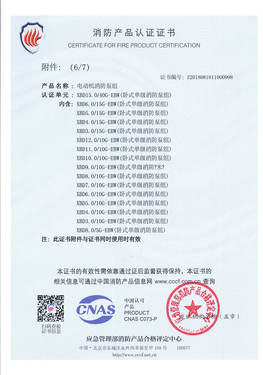 臥式單級EBW-消防產(chǎn)品認證證書(shū)