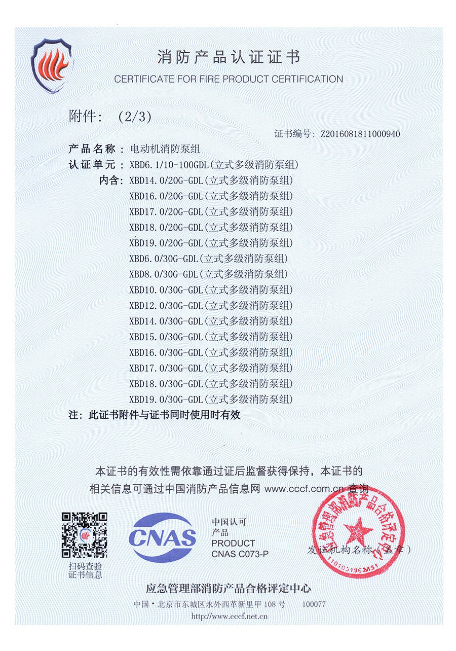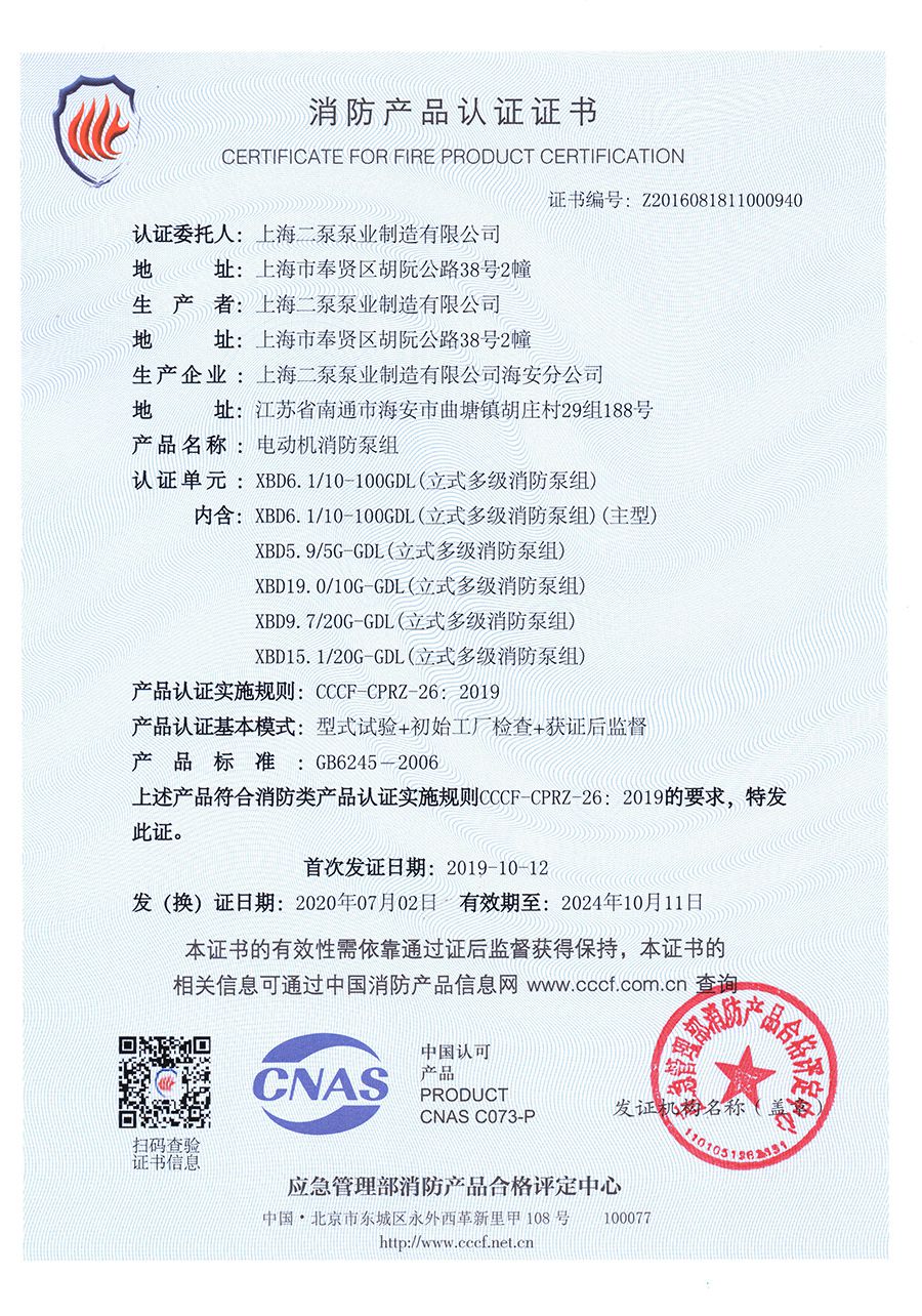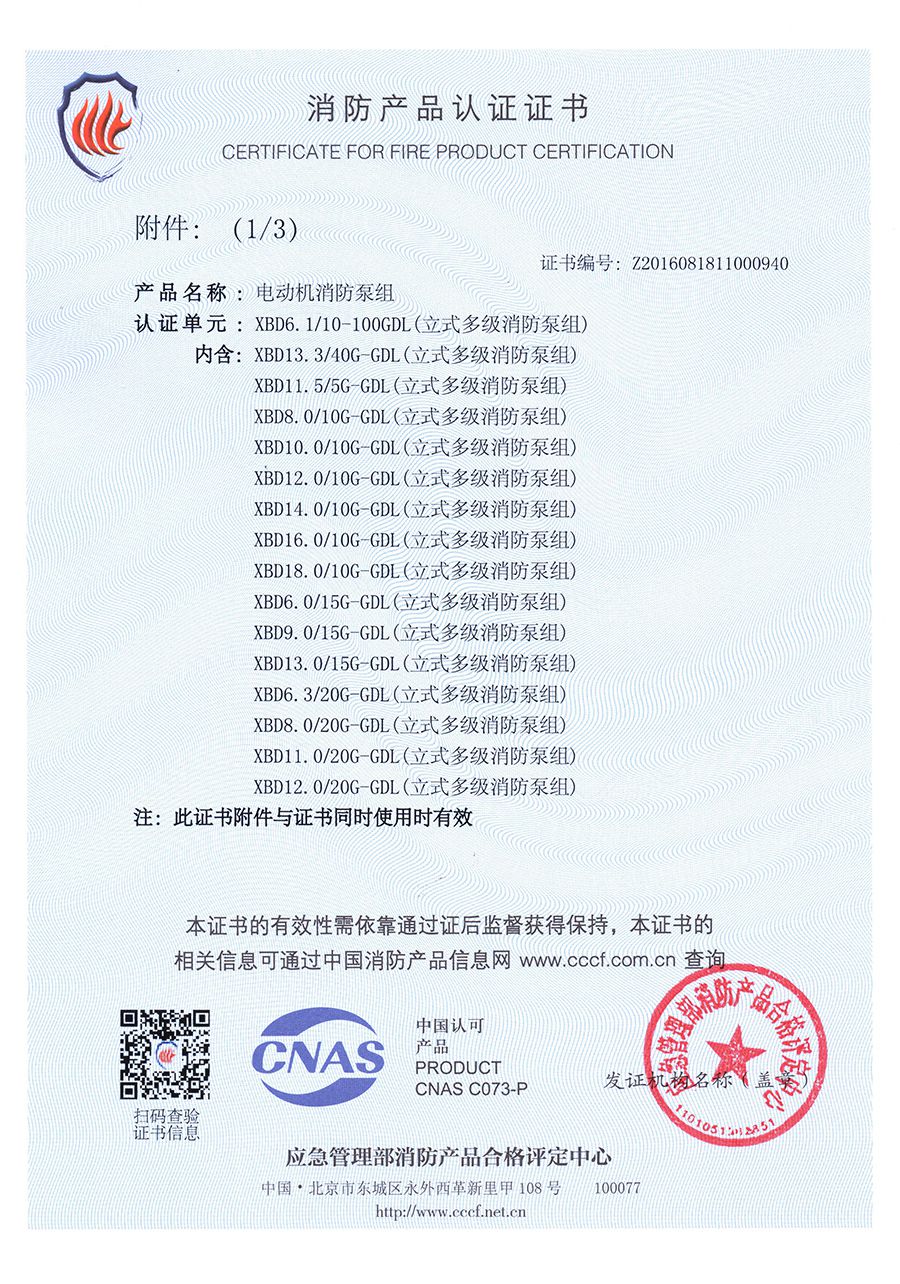 立式多級GDL-消防產(chǎn)品認證證書(shū)
